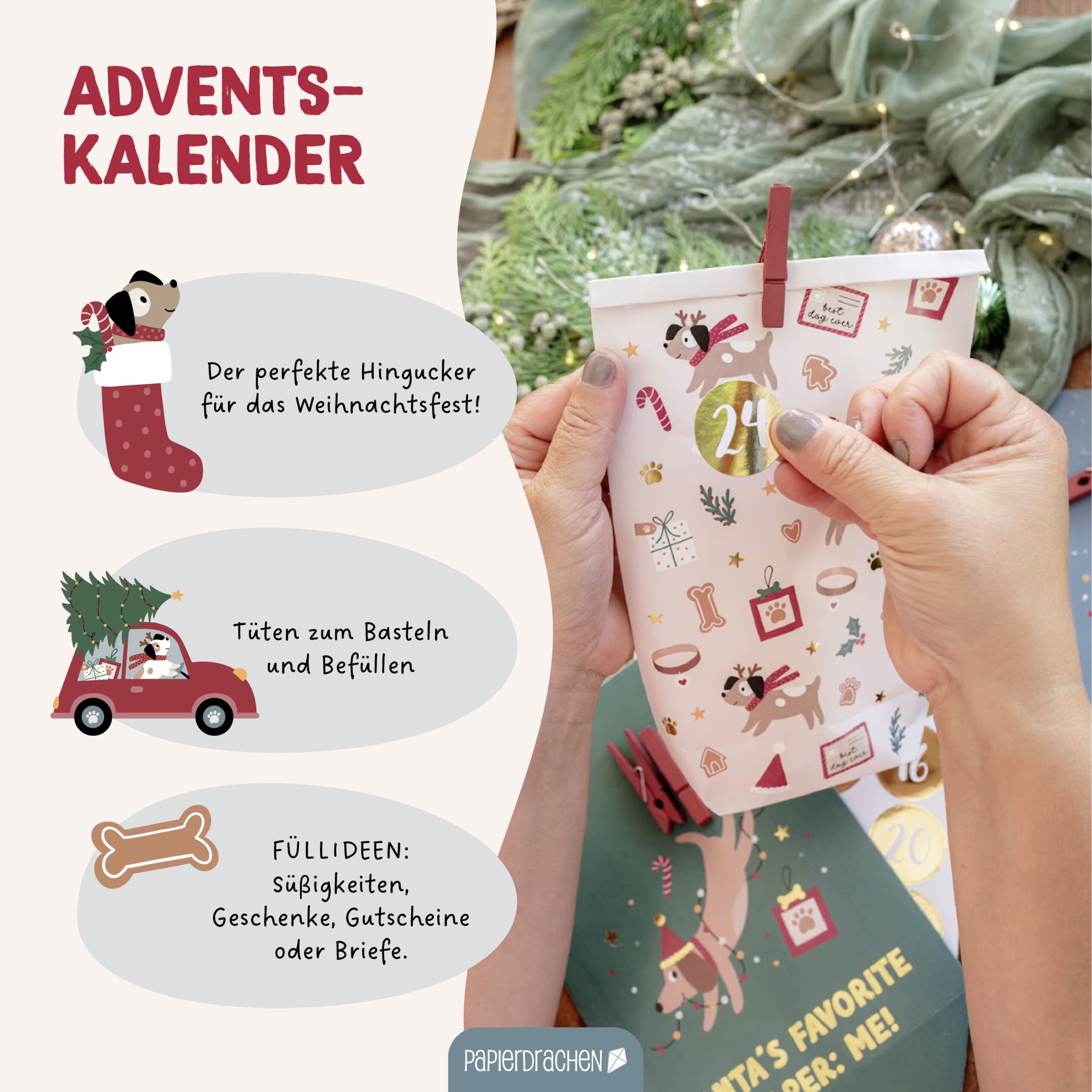 Mit dem Papierdrachen Adventskalender-Set gestaltest du einen einzigartigen DIY-Weihnachtskalender zum Befüllen. Im Set enthalten sind 24 stabile Papiertüten mit hochwertigen, liebevollen Motiven, 24 Holzclips und 24 Zahlensticker. Einfach befüllen, verschließen und dekorieren – schon entsteht dein persönlicher Adventskalender. Ideal für kleine Geschenke, Snacks oder liebevolle Botschaften. Ein echter Blickfang, der Kinderaugen zum Strahlen bringt und Erwachsenen Freude bereitet.
