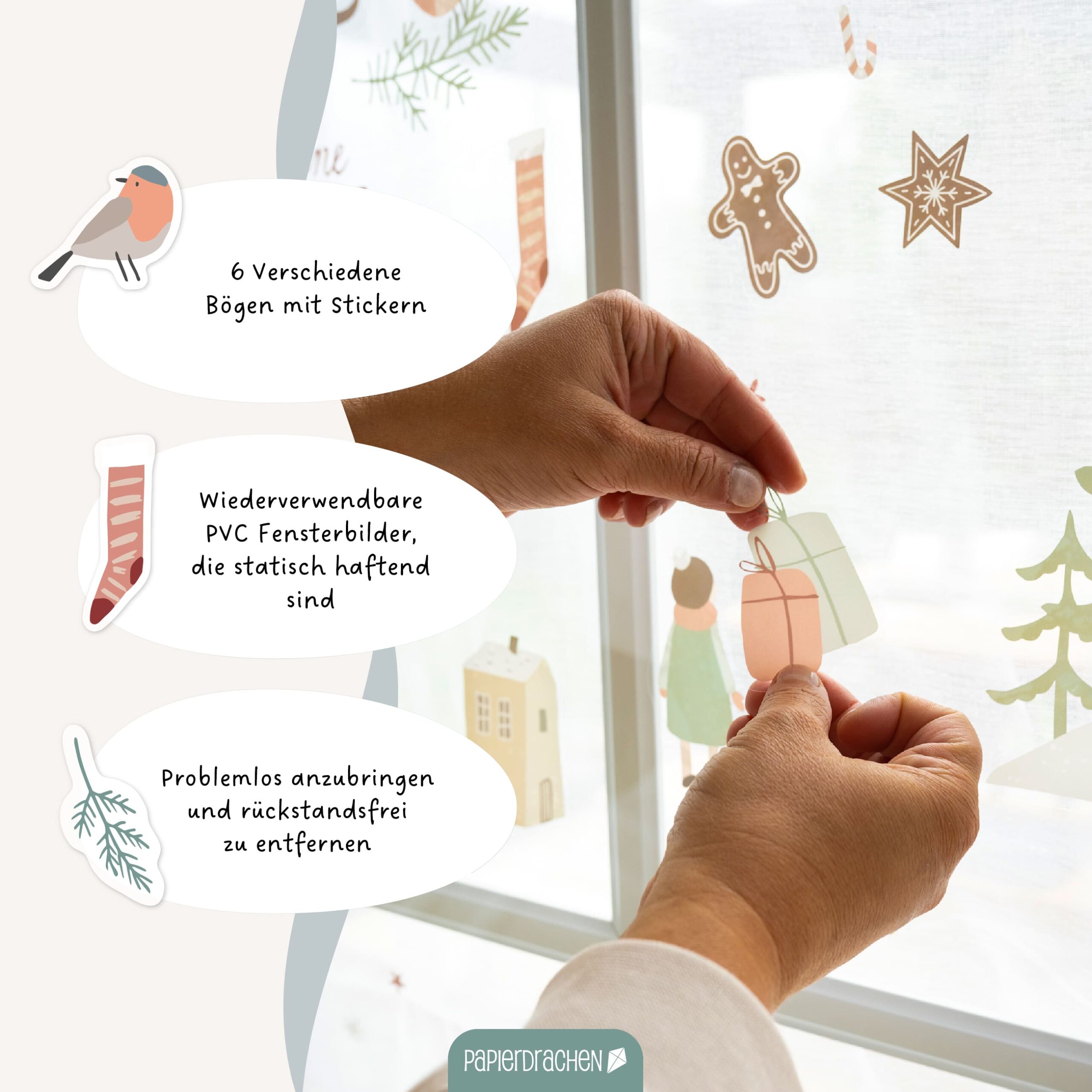 Dekoriere deine Fenster, Spiegel oder andere glatte Flächen mit unseren festlichen Fensterstickern. Das Set enthält 6 Stickerbögen mit zahlreichen Motiven – darunter fröhliche Tiere, Tannenbäume und weitere liebevoll gestaltete weihnachtliche Symbole. Die Aufkleber bestehen aus transparenter, statisch haftender Folie (PVC) und lassen sich ganz einfach ohne Kleber anbringen und rückstandslos entfernen.