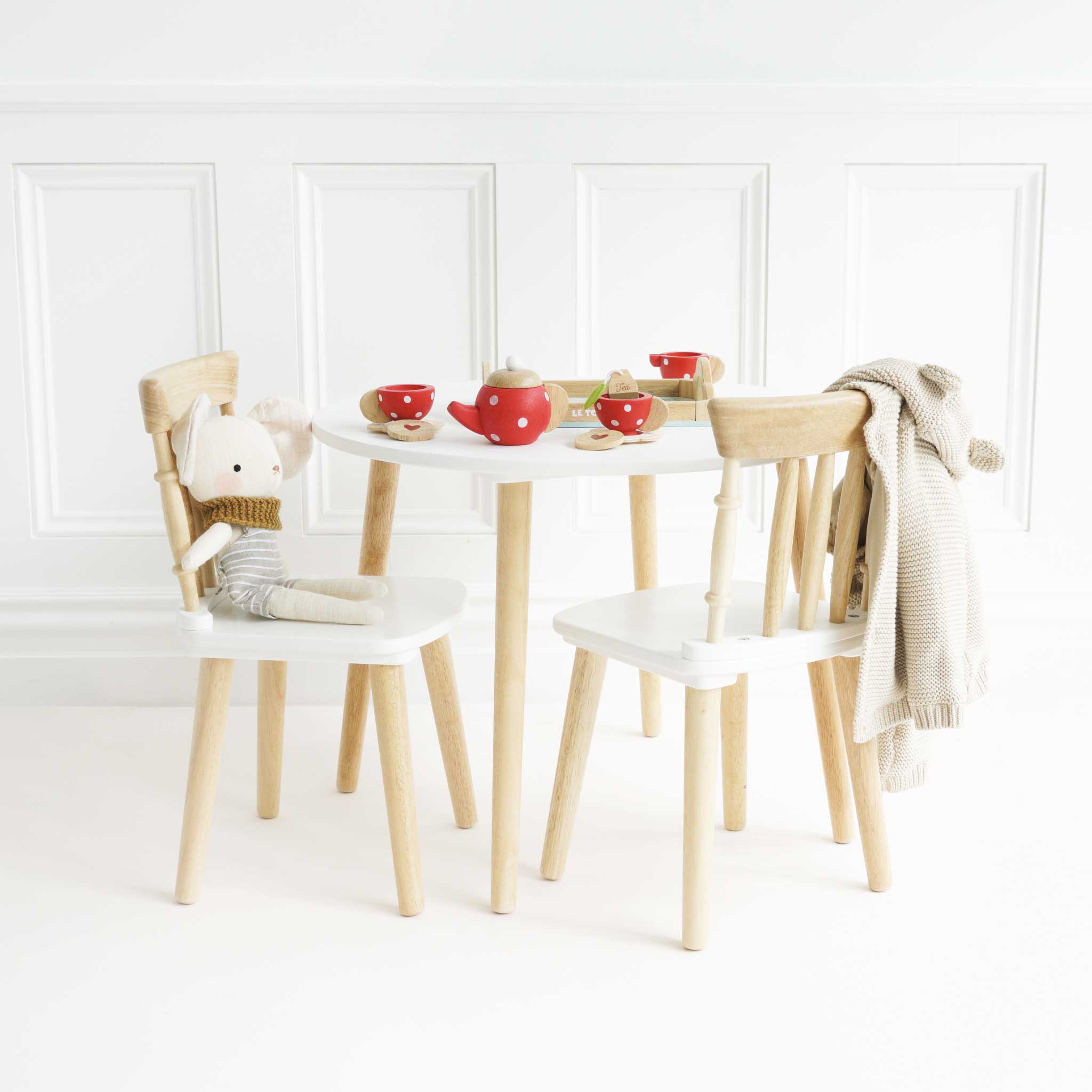 Dieses charmante Set besteht aus 2 Stühlen und einem Tisch, die aus einer Kombination aus massivem, nachhaltigem Gummibaumholz und Sperrholz gefertigt sind. Fertig mit einer Kombination aus frischer weißer Farbe und wunderschönem Sichtholz, perfekt für eine Vielzahl von Spielzimmern und Kinderzimmern. Geeignet für 3-6 Jahre, maximale Belastung 50 kg. Montage und Aufsicht durch Erwachsene erforderlich.