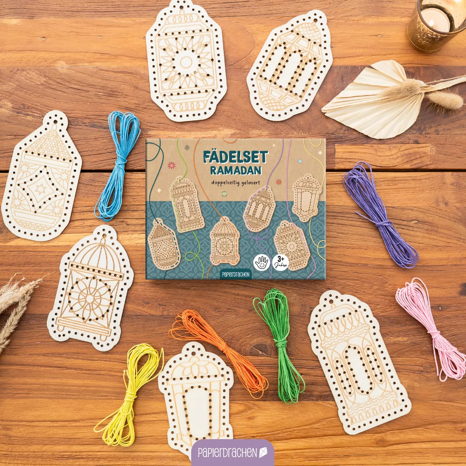 Starte kreativ in den Ramadan! Mit unserem Fädelset aus Holz kannst du dir bewusst Zeit nehmen und ein kleines DIY-Projekt starten. Sie eignen sich für Kinder und insbesondere auch für Kleinkinder ab drei Jahren, da die Nadel aus Kunststoff ist. Perfekt, um Feinmotorik zu üben und daher auch für Kindergärten und Grundschulen verwendbar. Nachdem du die sechs Laternen-Formen mit einem bunten Faden geschmückt hast, kannst du deine Werke als Dekoration für dein Zimmer nutzen.