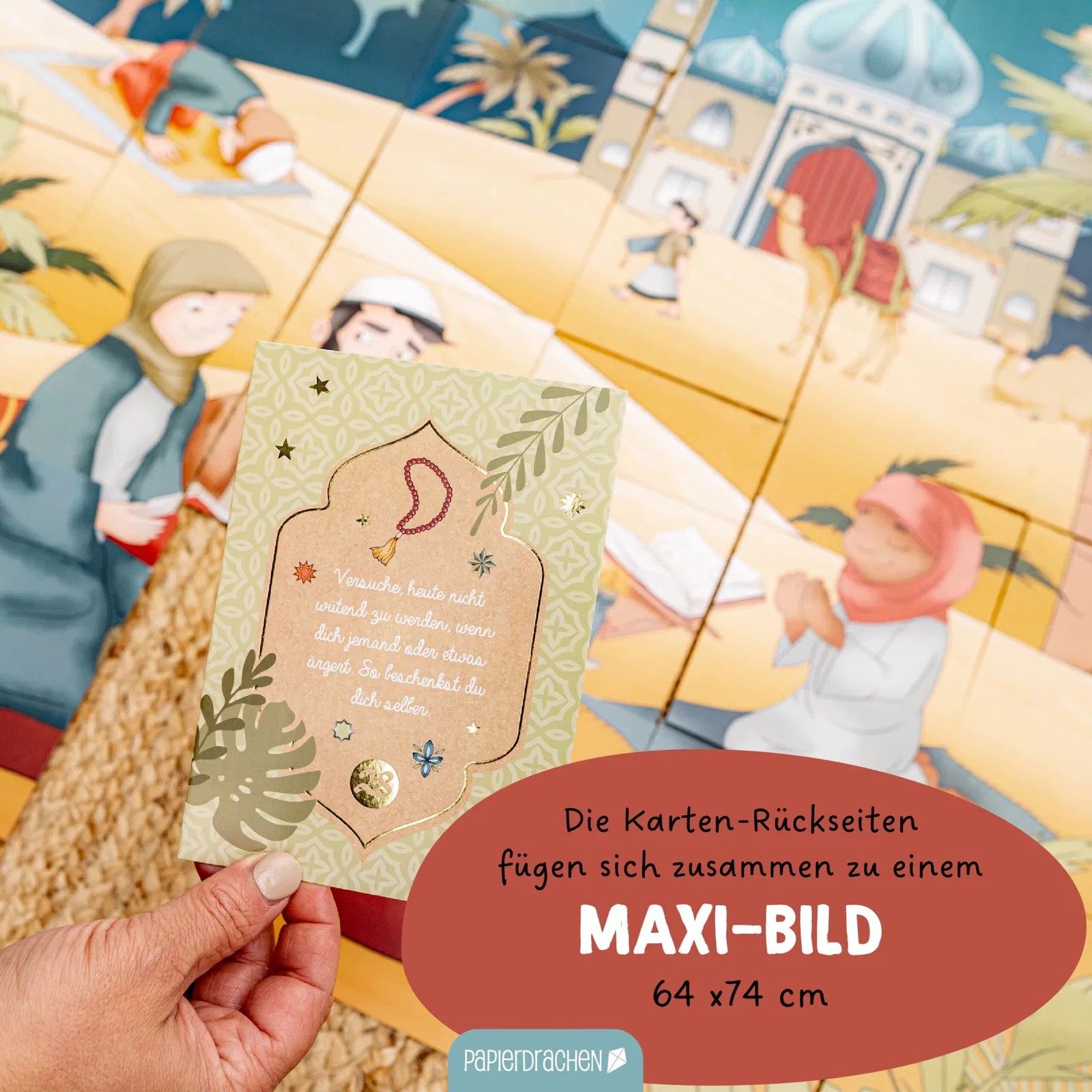 Entdecke den Ramadan-Kalender für Kinder– eine wundervolle Möglichkeit, den heiligen Monat Ramadan für die Kleinsten zu etwas ganz Besonderem zu machen. Dieser Kalender enthält 30 liebevoll gestaltete Karten, die jeden Tag des Fastenmonats mit inspirierenden Geschichten, Aufgaben und wertvollen Botschaften bereichern. Kinder lernen auf spielerische Weise die Bedeutung von Werten wie Geduld, Dankbarkeit und Gemeinschaft. Die Karten lassen sich zum Schluss zu einem stimmungsvollen Poster (Grösse 63 x 74 cm) zusammenfügen. Zusätzlich ist ein Ramadan-Countdown zum selbst Basteln enthalten.