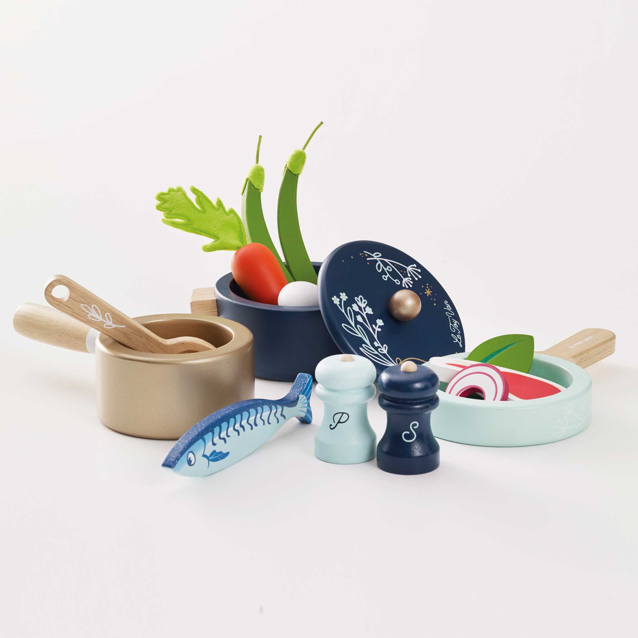 Ein schickes Kochgeschirr-Set aus Holz für angehende junge Köche. Kochen Sie ein Festmahl mit diesem süssen Spielzeug, das einen Schmortopf mit Deckel, einen Kochtopf, eine Bratpfanne, einen Holzlöffel, einen Pfannenwender sowie Salz und Pfeffer enthält.