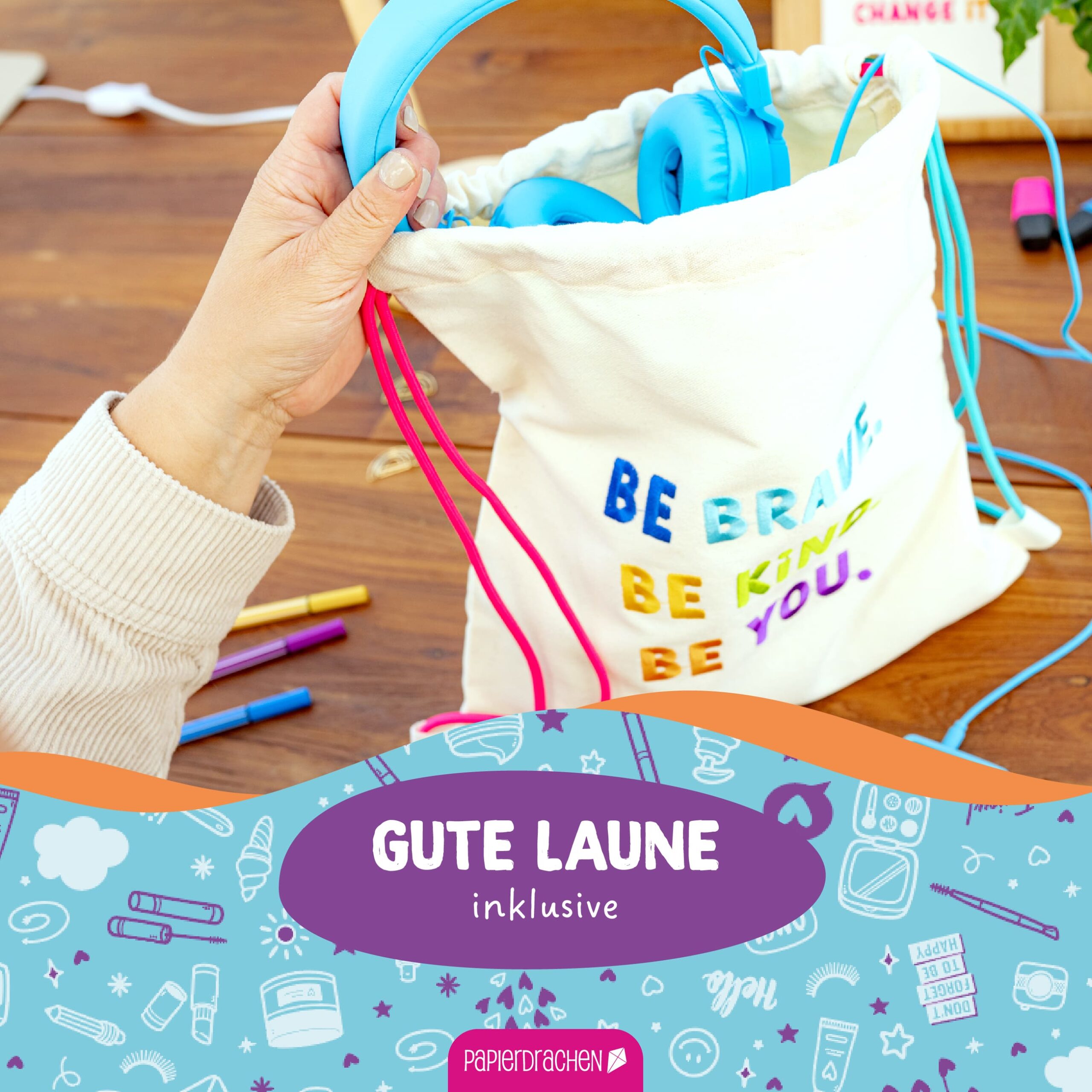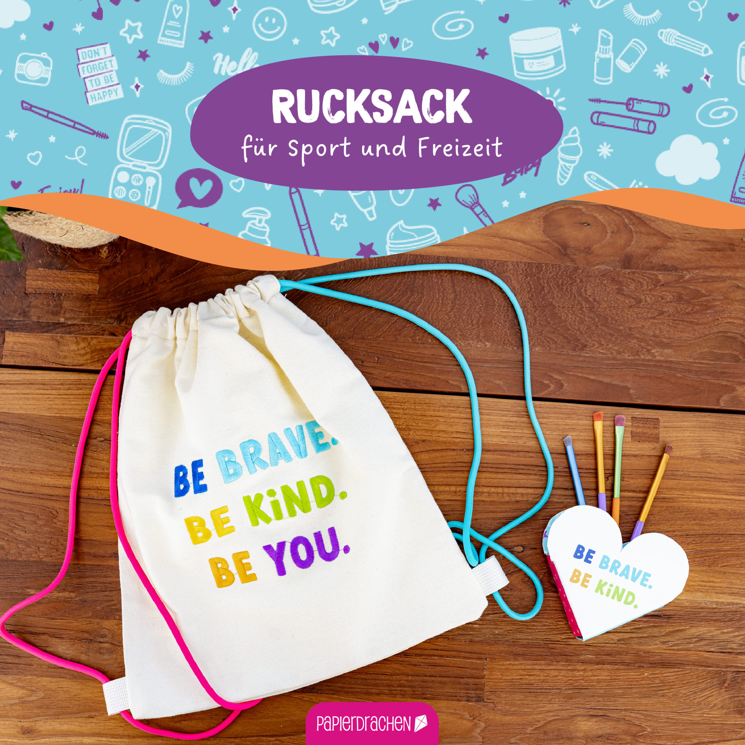 Mit bunter Bestickung in gut lesbaren Druckbuchstaben kommt deine Message überall gut an. Als besonderes Highlight sorgen die verschiedenfarbigen Trageriemen für einen zusätzlichen Farbakzent. Inklusive Stifthalter, den du aus der plastikfreien Verpackung basteln kannst.