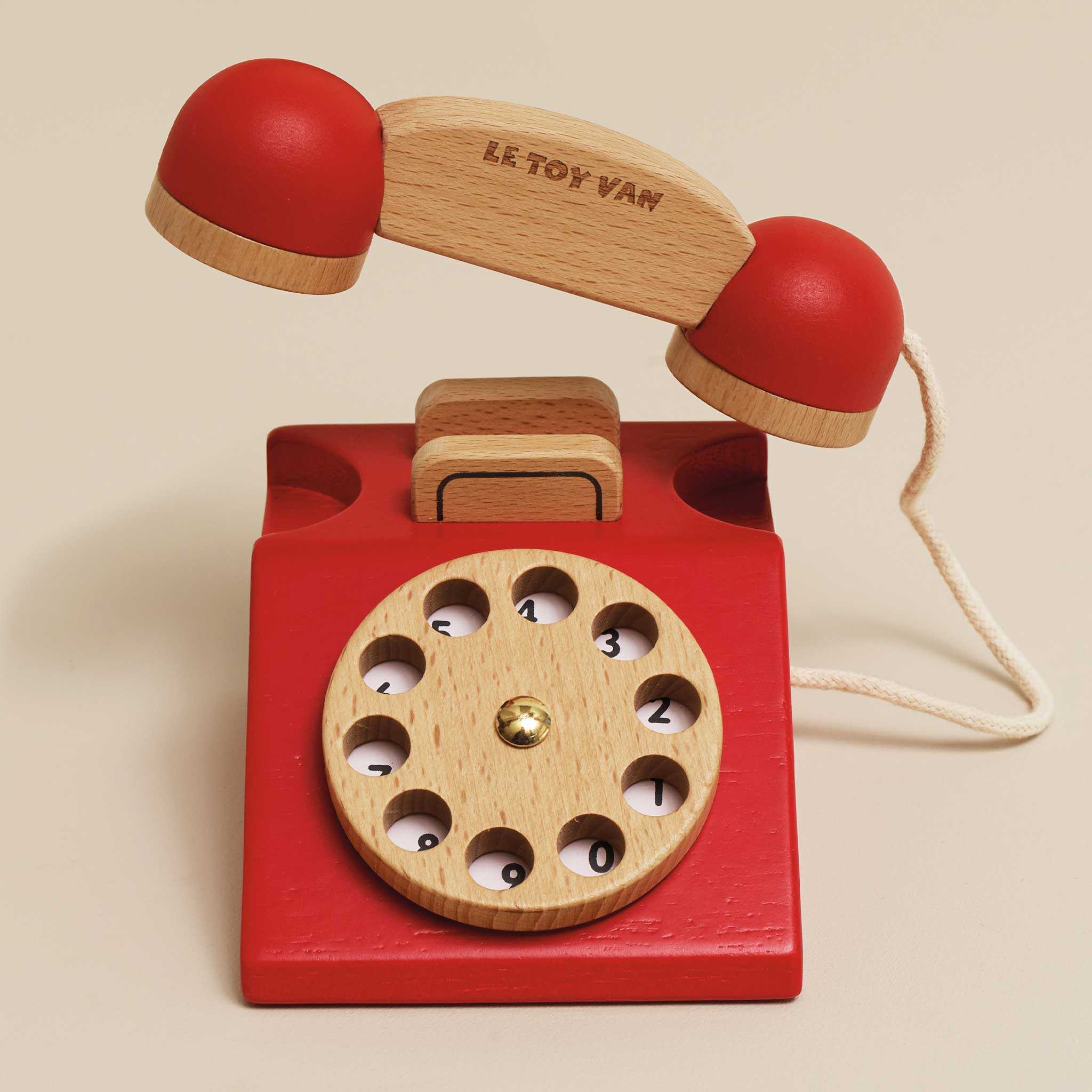 Klingeling! Dieses Spielzeugtelefon im Retro-Stil verfügt über klassische Ziffern und eine realistische Drehscheibe, um das Erkennen von Zahlen durch Spielen zu fördern. Es ist aus FSC-zertifiziertem Holz gefertigt und in unserem charakteristischen Rot mit natürlichen Holzakzenten lackiert – eine schöne Mischung aus Nostalgie und Lernen.