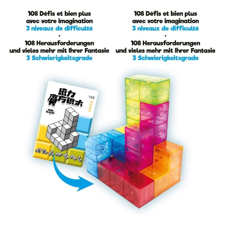 Der Magic Magnetic Cube besteht aus 7 transparenten 3D-Teilen und wird mit 54 Karten geliefert, die insgesamt 108 verschiedene Herausforderungen bieten. Mit den starken Magneten des Zauberwürfels kannst du feste Konstruktionen erstellen und durch das Verbinden der Teile sogar originelle Figuren erschaffen. Jeder gelöste Kniff ist eine persönliche Leistung und motiviert dich, immer weiterzumachen.